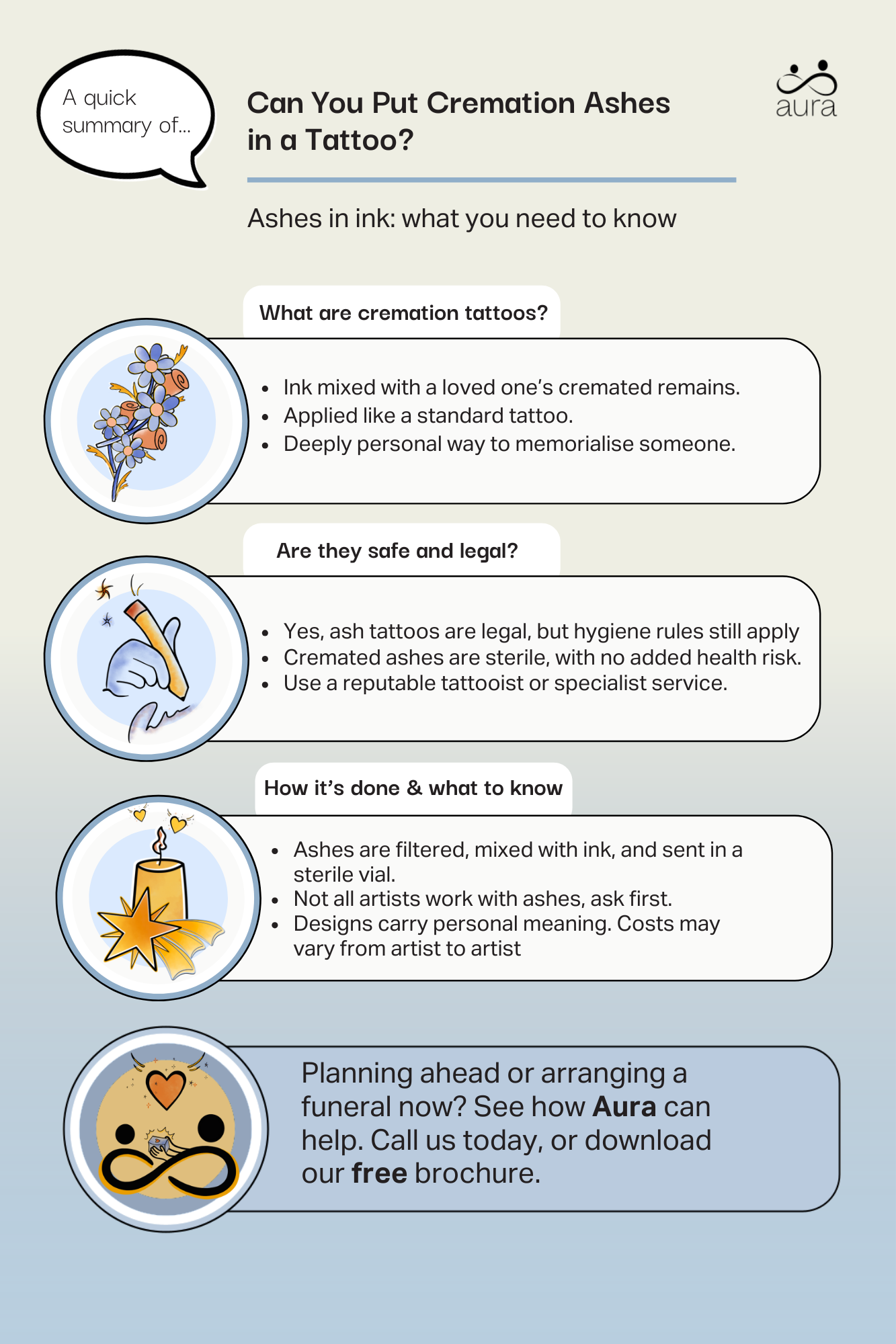 Think carefully about your design and choose an artist you trust. Ask about hygiene, how they incorporate ashes, and whether they’ve done similar work before. This is a permanent and deeply personal tribute, so it’s worth taking the time to feel confident in your decision.